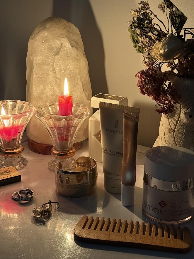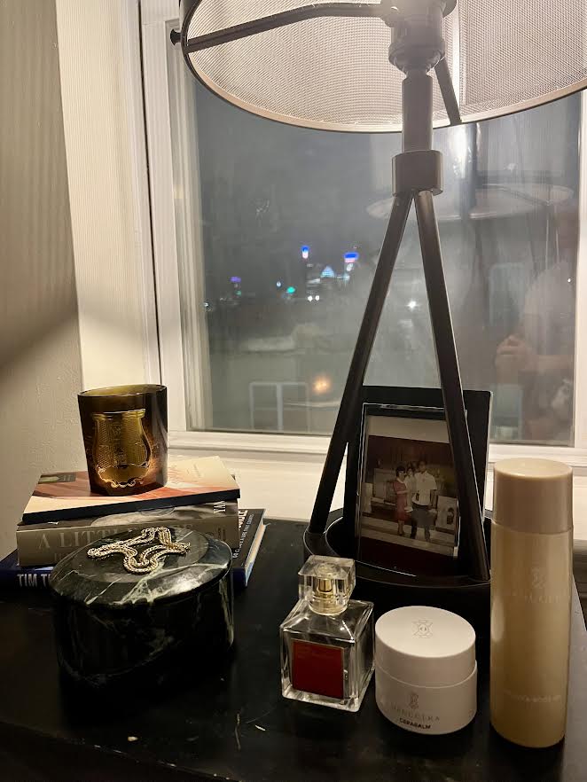 “A photo of my parents, framed by my grandmother Elisa. Ernesto by Trudon, a gratitude journal from my nephew Yves, and the books marking last year and this one. My marble jewelry holder from clients-turned-family, holding the gold chain my grandmother Antonia gave me at thirteen. MFK Baccarat Rouge 540 to scent the room, and Danucera Cerabalm and Veluxa Body Oil for nightly hydration. I love the finer things, but the photo, the chain, and my journal keep me grounded in gratitude.”