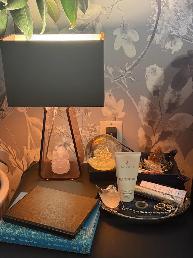 “I’ve always loved crystals and organic materials and I collect snow globes and pine cones.:) I keep a book and a kindle on my nightstand at all times as I’m an avid reader. Hand cream, magnesium cream and a lip treatment are a nighttime routine nonnegotiable. Slip eye mask is a staple as soon as morning light breaks in”.