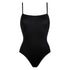 One-piece tank swimsuit, wraparound neckline seam, straight back, thin straight straps.
