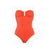 One-piece bustier swimsuit, Bust shirring at front and sides, U-shaped metal link between cups, Gripper tape.