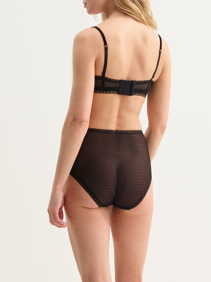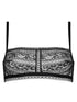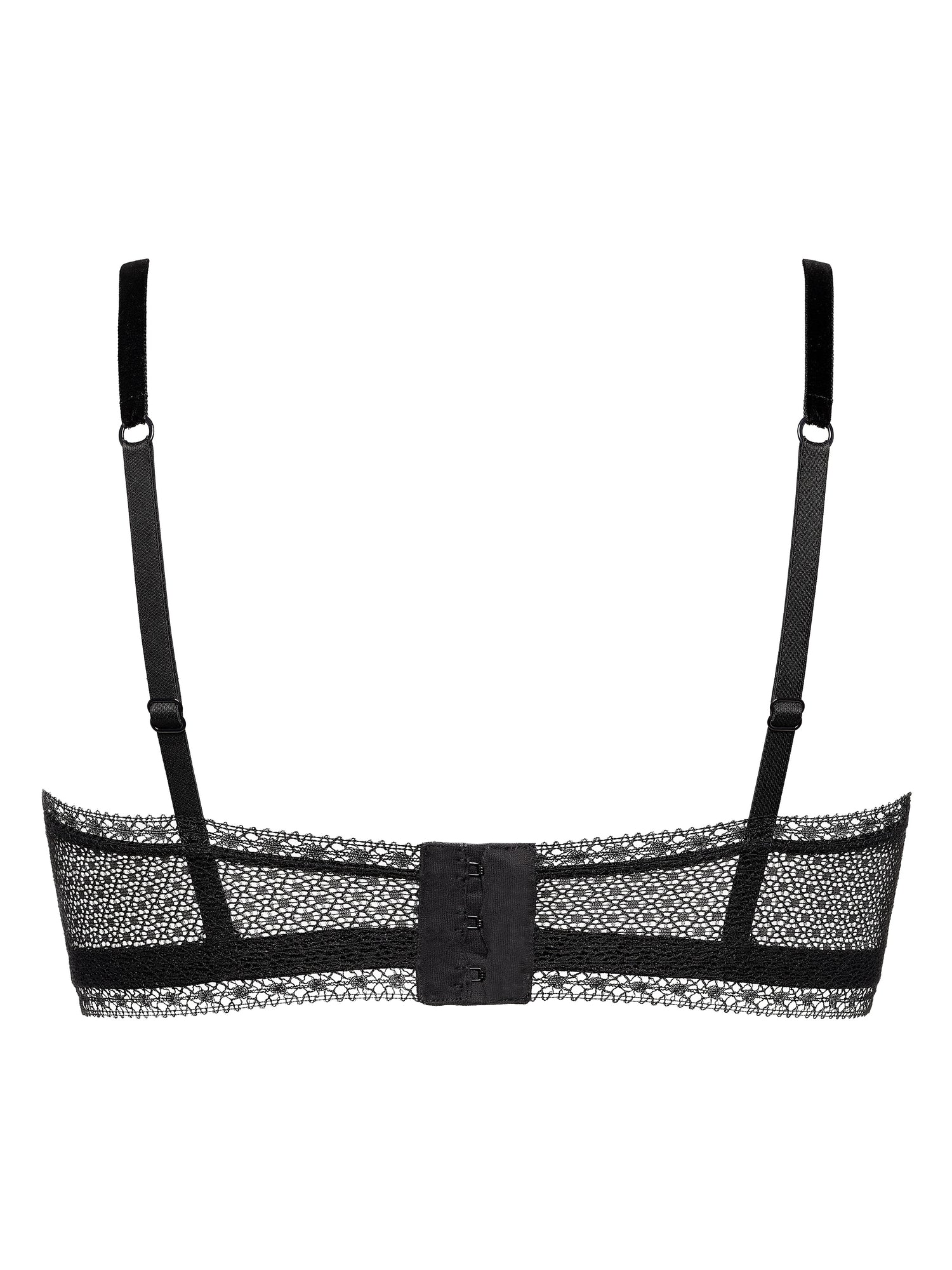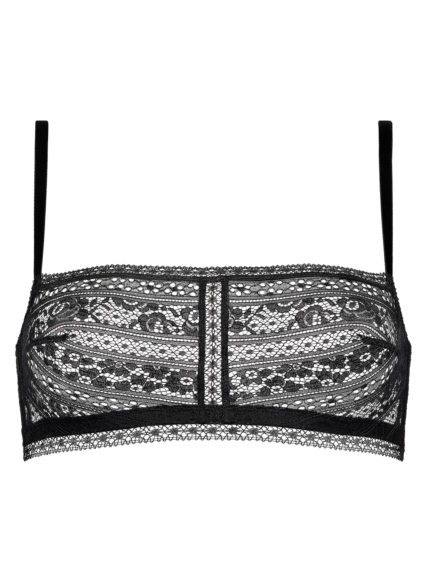 Crop top bra, Lace edges: neckline and underbust, upper back, and underarms, Construction on an elastic thorax band, Inlay details at the center of the chest, Thin adjustable straps, Bust darts, Straight back. A stretch Leavers lace with a stripe pattern defines this lingerie and homewear line.