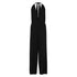 Loose jumpsuit, deep V neckline, elastic waist, backless, raw seam: bottom, wraparound halter tie.