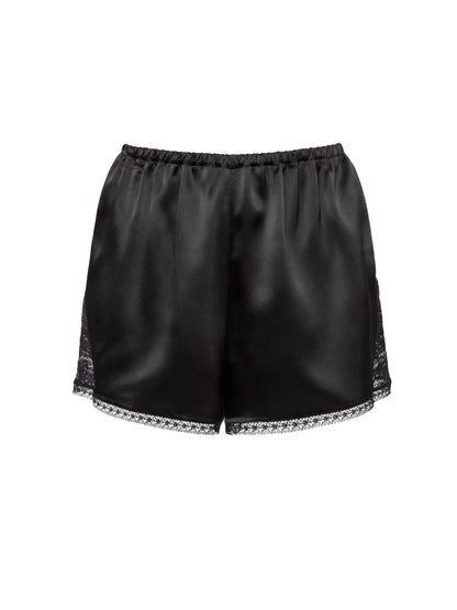 Shorts, Lace inserts on the sides, Elastic at the waist, Lace trim at the hem. A stretch Leavers lace with a stripe pattern defines this lingerie and homewear line.