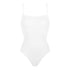 One-piece tank swimsuit, wraparound neckline seam, straight back, thin straight straps.