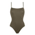 One-piece tank swimsuit, wraparound neckline seam, straight back, thin straight straps.