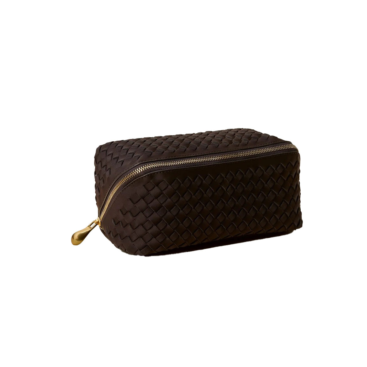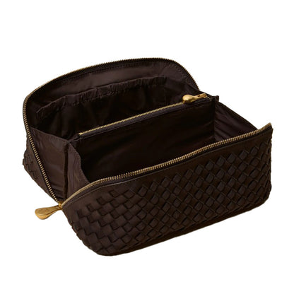 Handwoven from the signature neoprene in true black, the Caravan Medium Cosmetic Case is a must-have travel makeup bag and toiletry case. With a structured silhouette and roomy interior, it features a secure zipper closure, a center zippered pocket, and four open compartments to keep your essentials organized. Spacious enough for a multi-day trip yet sleek enough to pack as carry-on toiletry bag, this woven neoprene cosmetic case makes travel effortless.