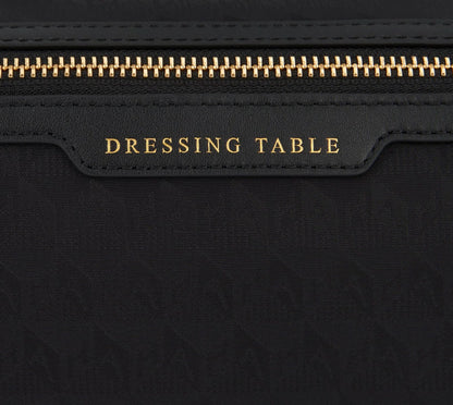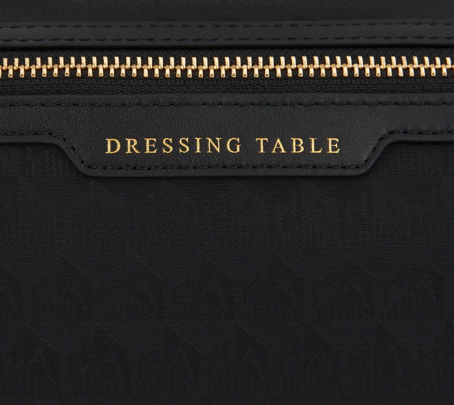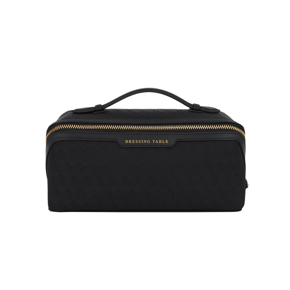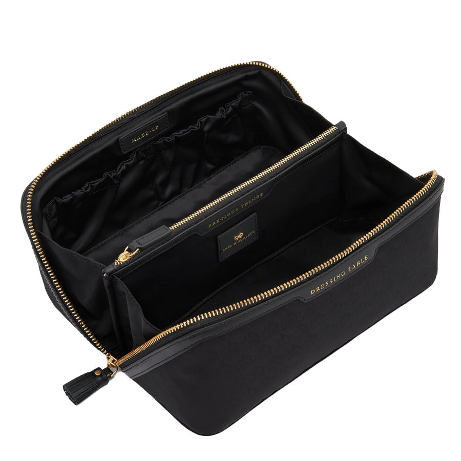 Elegantly organize your travel essentials with this functional dressing table bag from Anya Hindmarch that opens up to lay flat. With an easy-carry handle, this bag is made with jacquard cotton and calf leather and will see you travelling with ease and style.