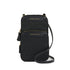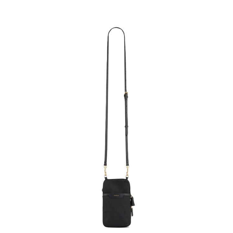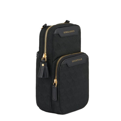 External features: Tassel zip pull, leather zip pull, D ring, front pocket labelled 'ESSENTIALS', main pocket labelled 'SUNGLASSES', back pocket labelled 'PHONE', adjustable leather cross-body strap