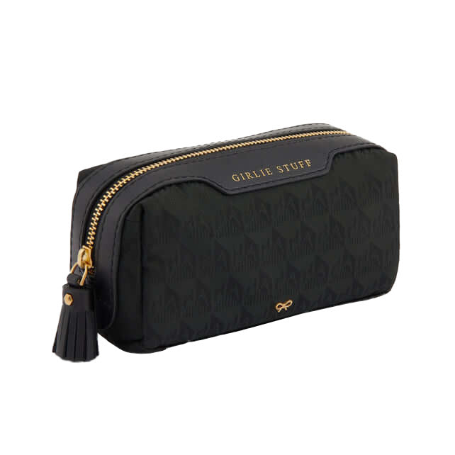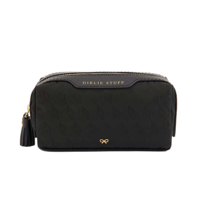 External features: Gold-tone Anya Hindmarch bow, patent leather trim with labelled 'GIRLIE STUFF' nameplate, gold-tone zip with patent leather zip pulls