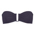 Bandeau, bust shirring at centre front and sides, U-shaped metal link between cups, side stays, large pendant ring at the back.